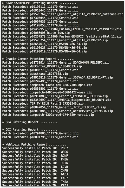 opatch napply $PATCH_FOLDER/biappsshiphome/generic -silent -id 16913445,16997936,19452953,19526754,19526760,19822893,19823874,20022695,20257578