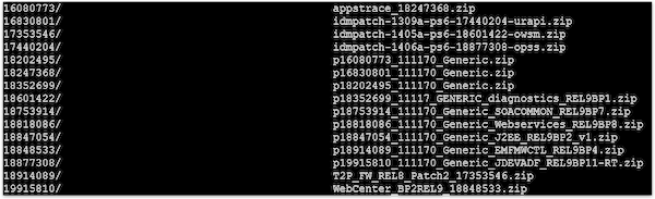 $COMMON_ORACLE_HOME/OPatch/opatch napply $PATCH_FOLDER/oracle_common/generic -silent -oh $COMMON_ORACLE_HOME -id 16080773,16830801,17353546,17440204,18202495,18247368,18352699,18601422,18753914,18818086,18847054,18848533,18877308,18914089,19915810