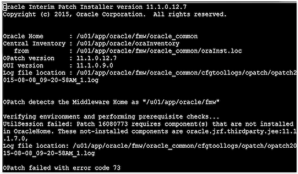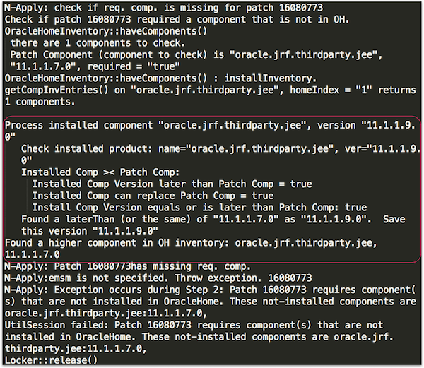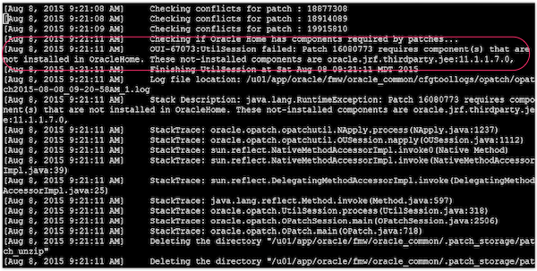 Here you will see the error, that a component is missing. Patch ######## requires component(s) that are not installed in OracleHome. These not-installed components are oracle.jrf.thirdparty.jee:11.1.1.7.0. Notice also that in this log there is a path to another log file location. The path is in the $COMMON_ORACLE_HOME/cfgtoollogs/opatch/ directory. This directory has more detailed logs specific to patches applied to oracle_common. Additionally, there are logs under $ORACLE_HOME/cfgtoollogs/opatch/, $WL_HOME/cfgtoollogs/opatch/, and $ODI_HOME/cfgtoollogs/opatch/. These locations are very helpful to know, so you can find the logs for each group of patches in the same relative path.