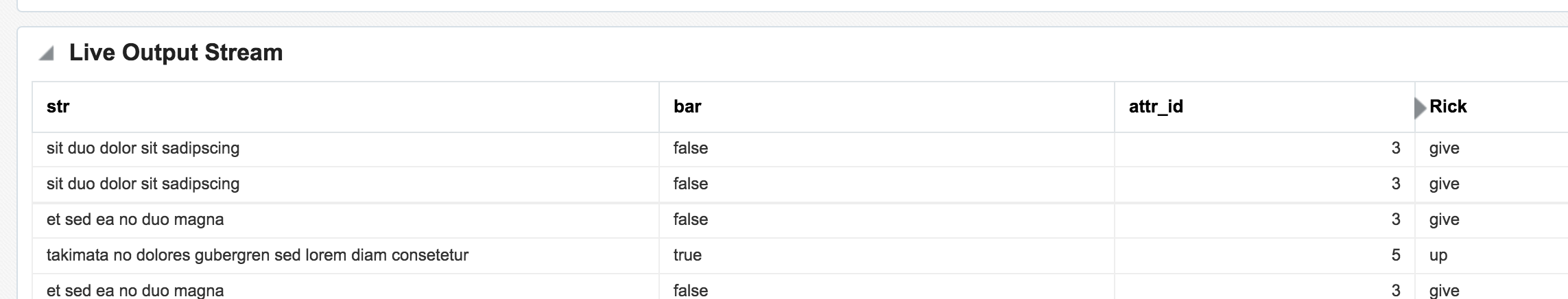 - Streams - definitions of sources of data such as Kafka, JMS, and a dummy data generator (event generator)
