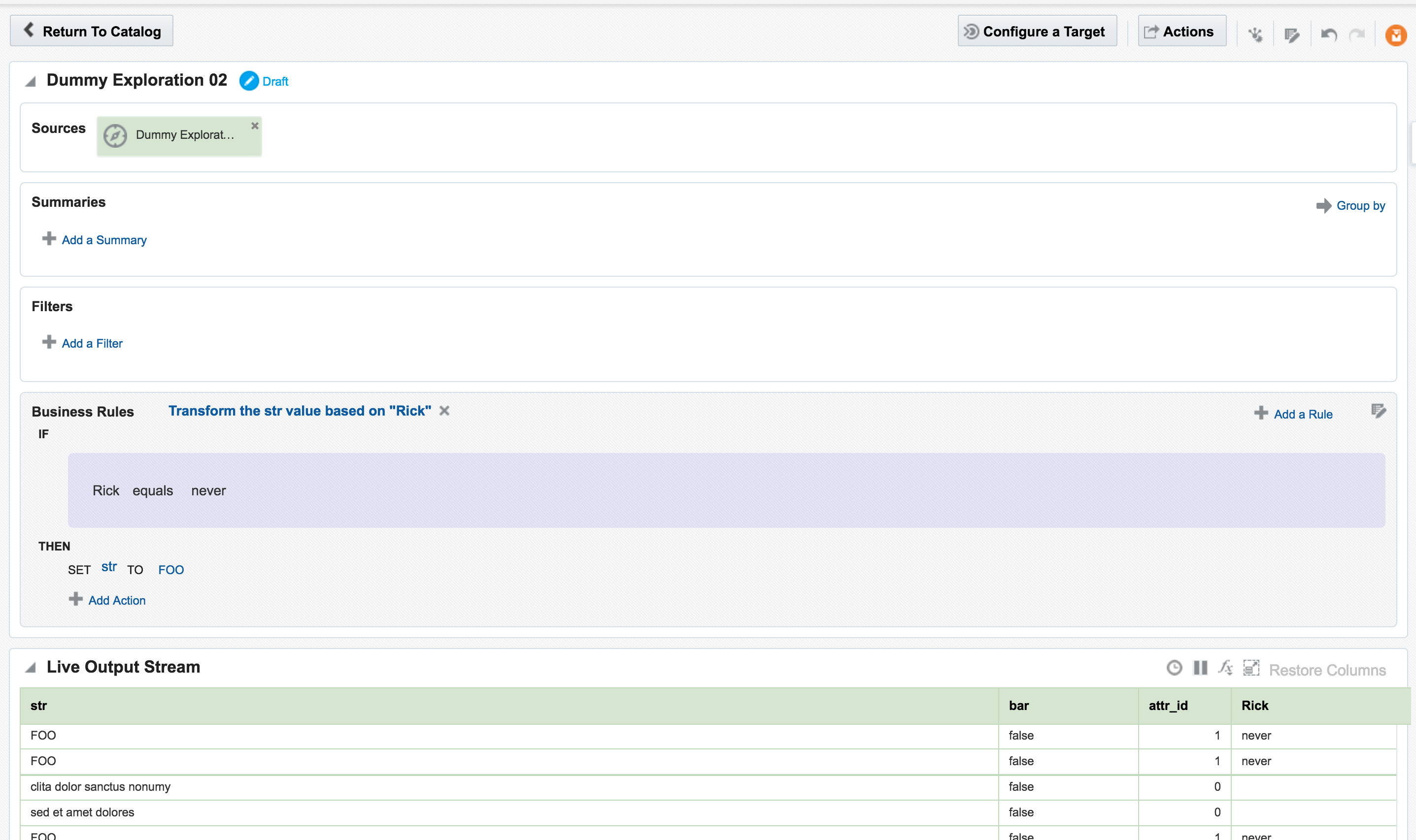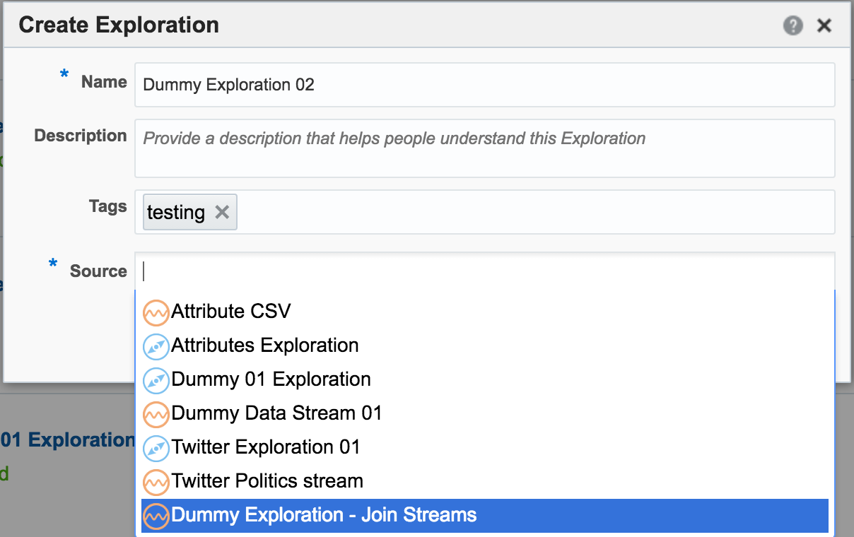Once an Exploration is Published it can be used as the Source for subsequent Explorations, enabling you to map out a pipeline based on multiple source streams and transformations. Here we're taking the exploration created just above that joined the two streams together, and using the output as the source for a new Exploration: