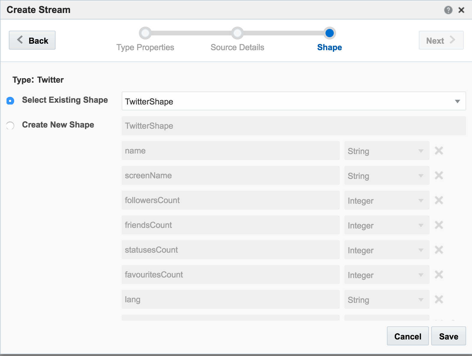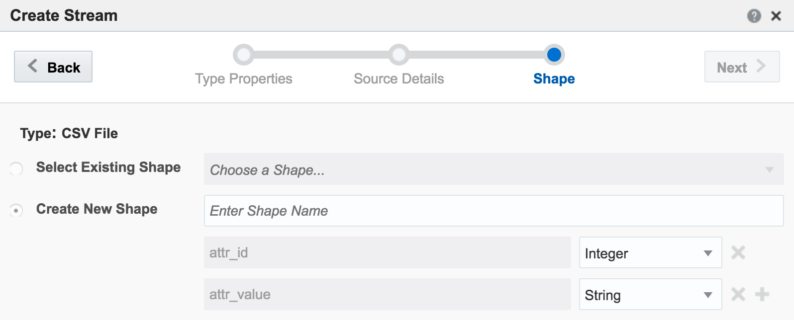 The stream type is CSV, and I can configure how often OSA reads from it, as well as telling OSA to loop back to the beginning when it's read to the end, thus simulating a proper stream. The ‘shape’ is picked up automatically from the file, based on the first row (headers) and then inferred data types: