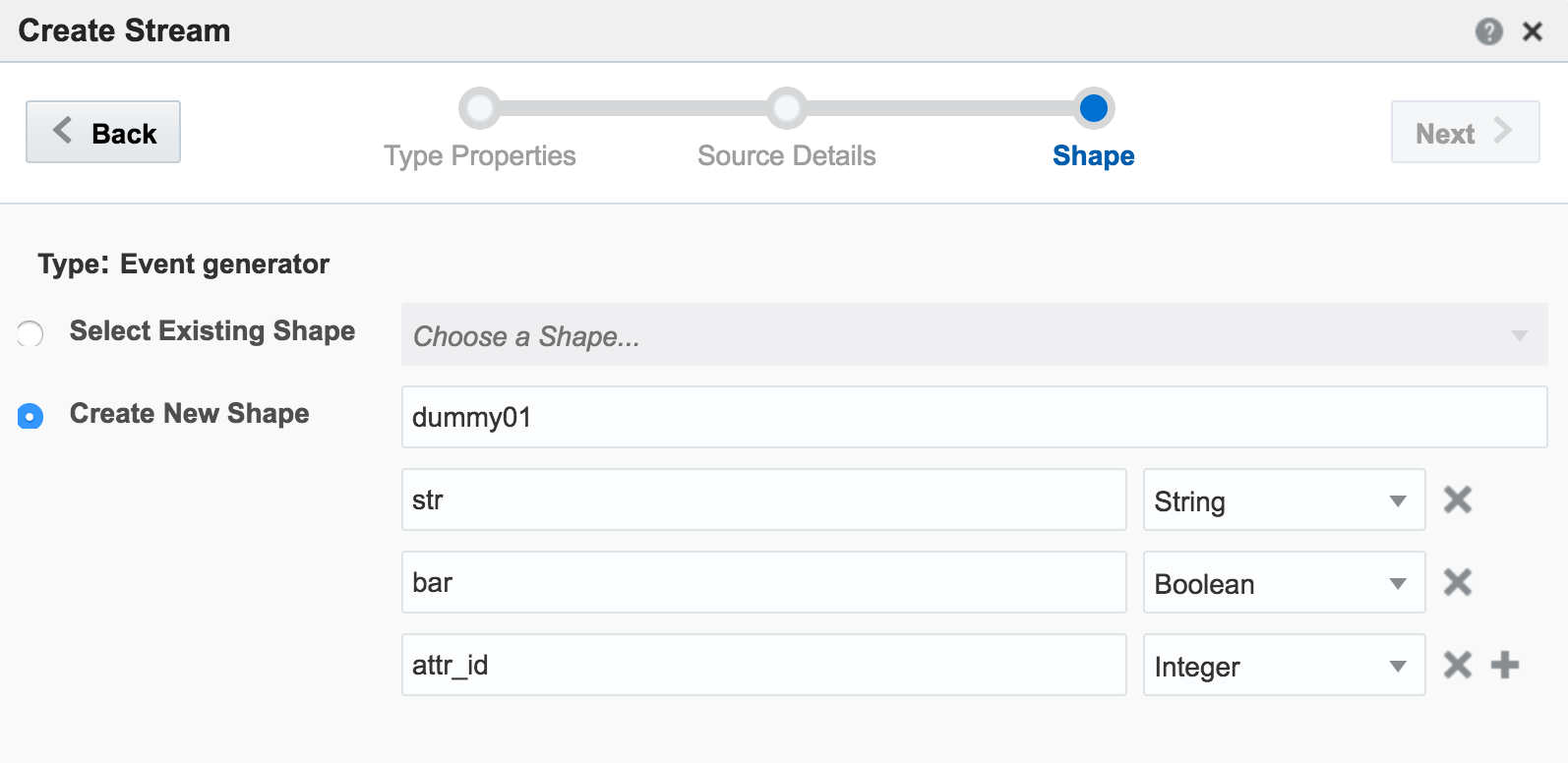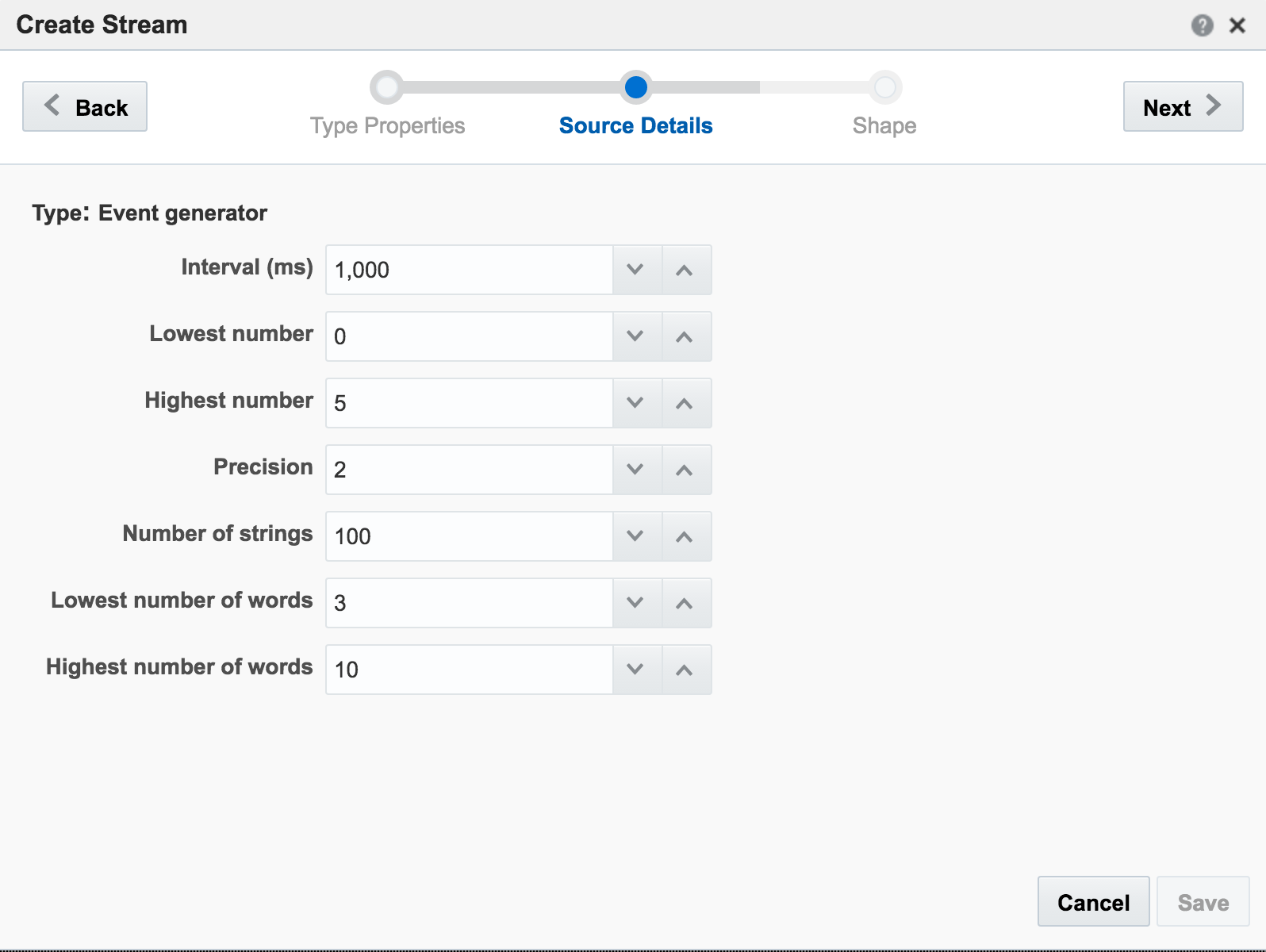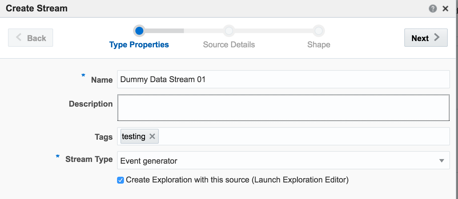 From the Catalog page I create a new Stream, using Event Generator as the Type: