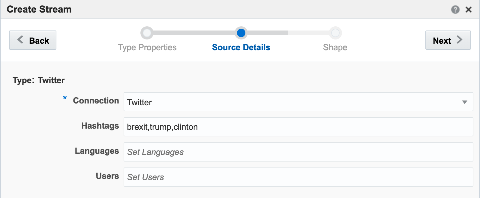 The first example I’ll show is the canonical big data/streaming example everywhere – Twitter. Twitter is even built into OSA as a Stream source. If you go to https://dev.twitter.com you can get yourself a set of credentials enabling you to query the live Twitter firehose for given hashtags or users.