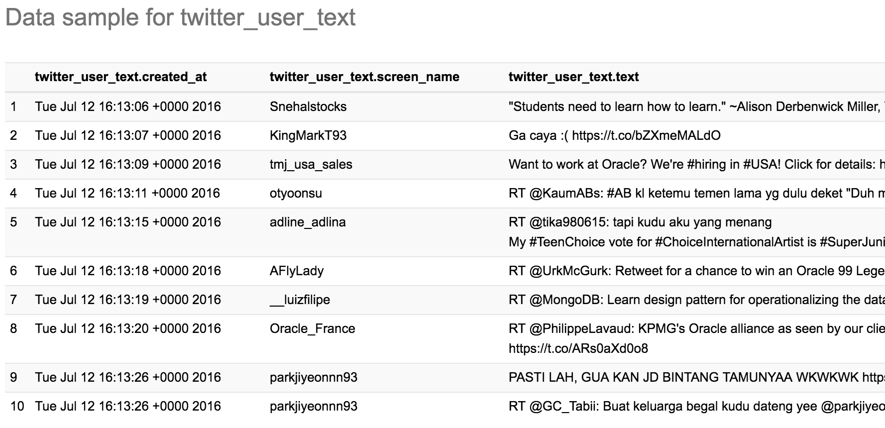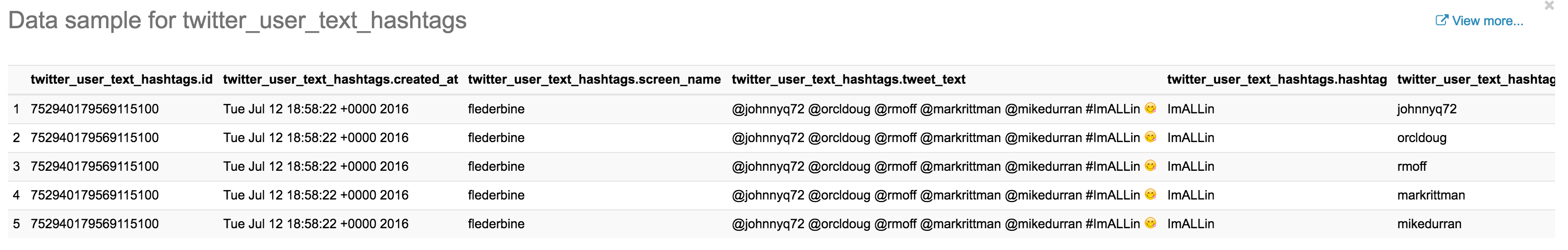 +------------------+--------------------+---------------+--------------------+-------+---------------+ | id| created_at| screen_name| tweet_text|hashtag| screen_name| +------------------+--------------------+---------------+--------------------+-------+---------------+ |752940179569115136|Tue Jul 12 18:58:...| flederbine|@johnnyq72 @orcld...|ImALLin| johnnyq72| |752940179569115136|Tue Jul 12 18:58:...| flederbine|@johnnyq72 @orcld...|ImALLin| orcldoug| |752940179569115136|Tue Jul 12 18:58:...| flederbine|@johnnyq72 @orcld...|ImALLin| rmoff| |752940179569115136|Tue Jul 12 18:58:...| flederbine|@johnnyq72 @orcld...|ImALLin| markrittman| |752940179569115136|Tue Jul 12 18:58:...| flederbine|@johnnyq72 @orcld...|ImALLin| mikedurran| +------------------+--------------------+---------------+--------------------+-------+---------------+