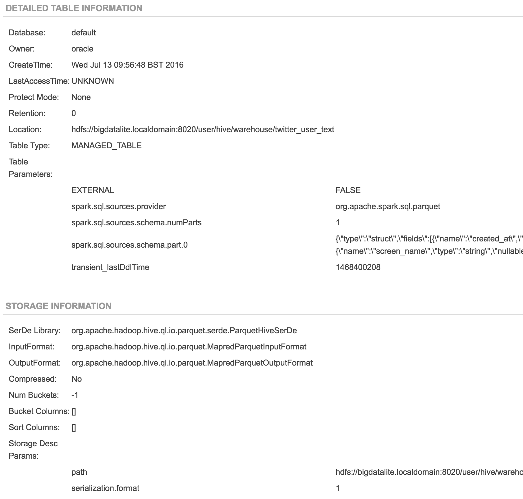 You may decide after looking at this that you’d rather just go back to Hive and SerDes, and as is frequently the case in ‘data wrangling’ there’s multiple ways to achieve the same end. The route you take comes down to personal preference and familiarity with the toolsets. In this particular case I'd still go for SparkSQL for the initial exploration as it's quicker to 'poke around' the dataset than with defining and re-defining Hive tables -- YMMV. A final point to consider before we dig in is that SparkSQL importing JSON and saving back to HDFS/Hive is a static process, and if your underlying data is changing (e.g. streaming to HDFS from Flume) then you would probably want a Hive table over the HDFS file so that it is live when queried.