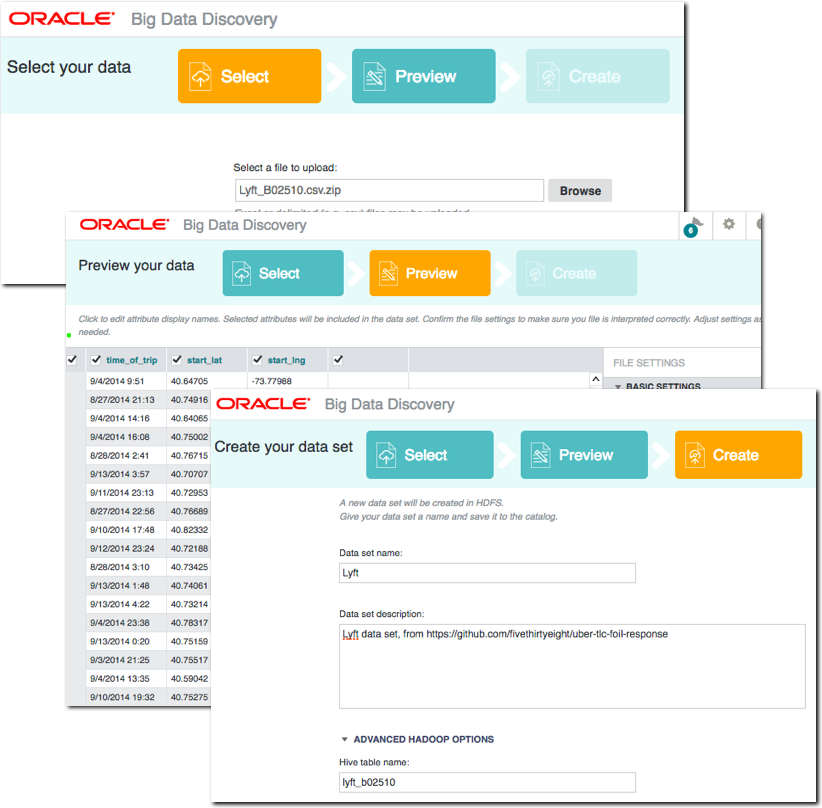 Big Data Discovery (BDD) is a great tool for exploring, transforming, and visualising data stored in your organisation’s Data Reservoir. I presented a workshop on it at a recent conference, and got an interesting question from the audience that I thought I’d explore further here. Currently the primary route for getting data into BDD requires that it be (i) in HDFS and (ii) have a Hive table defined on top of it. From there, BDD automagically ingests the Hive table, or the data_processing_CLI is manually called which prompts the BDD DGraph engine to go and sample (or read in full) the Hive dataset.