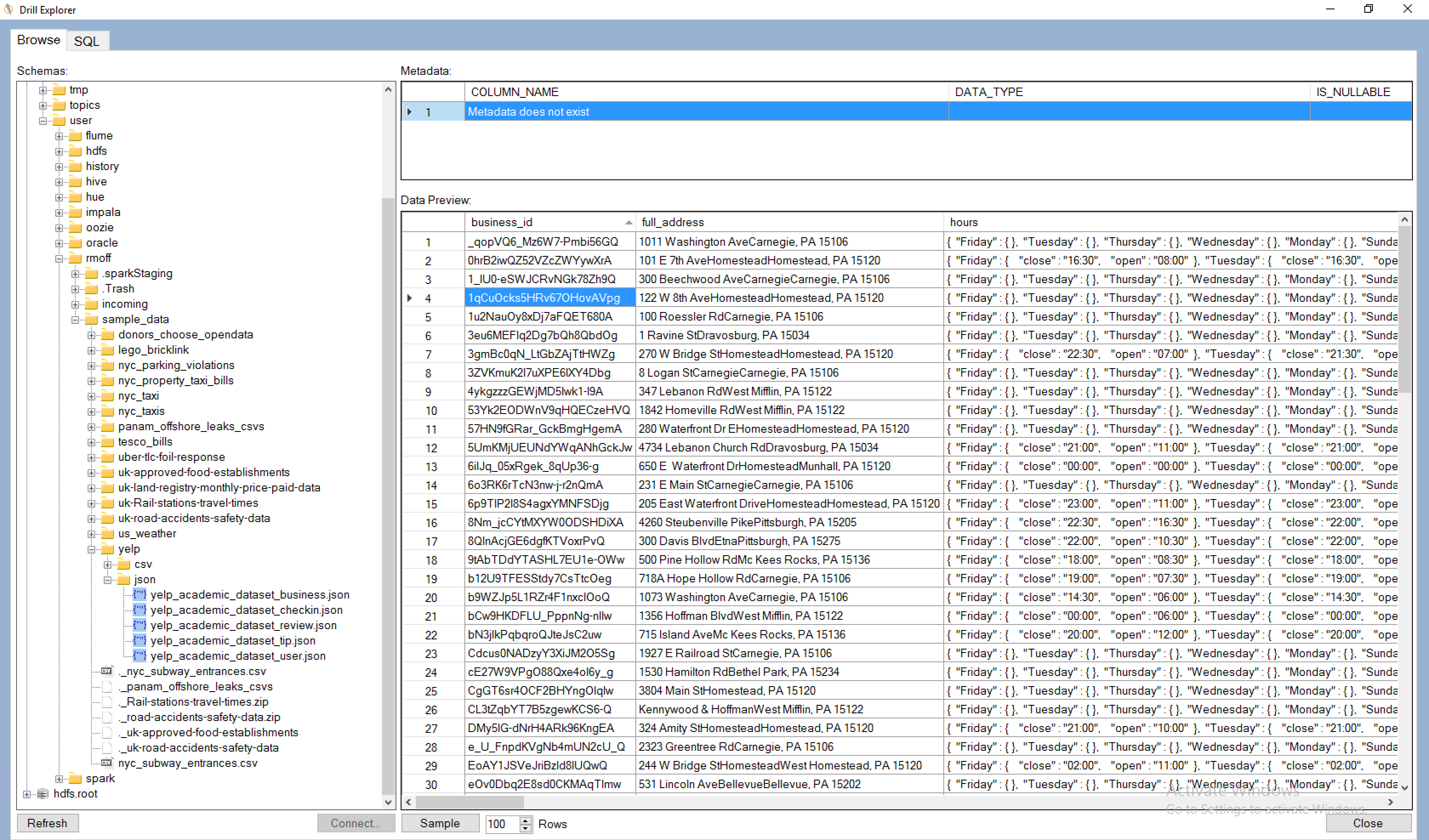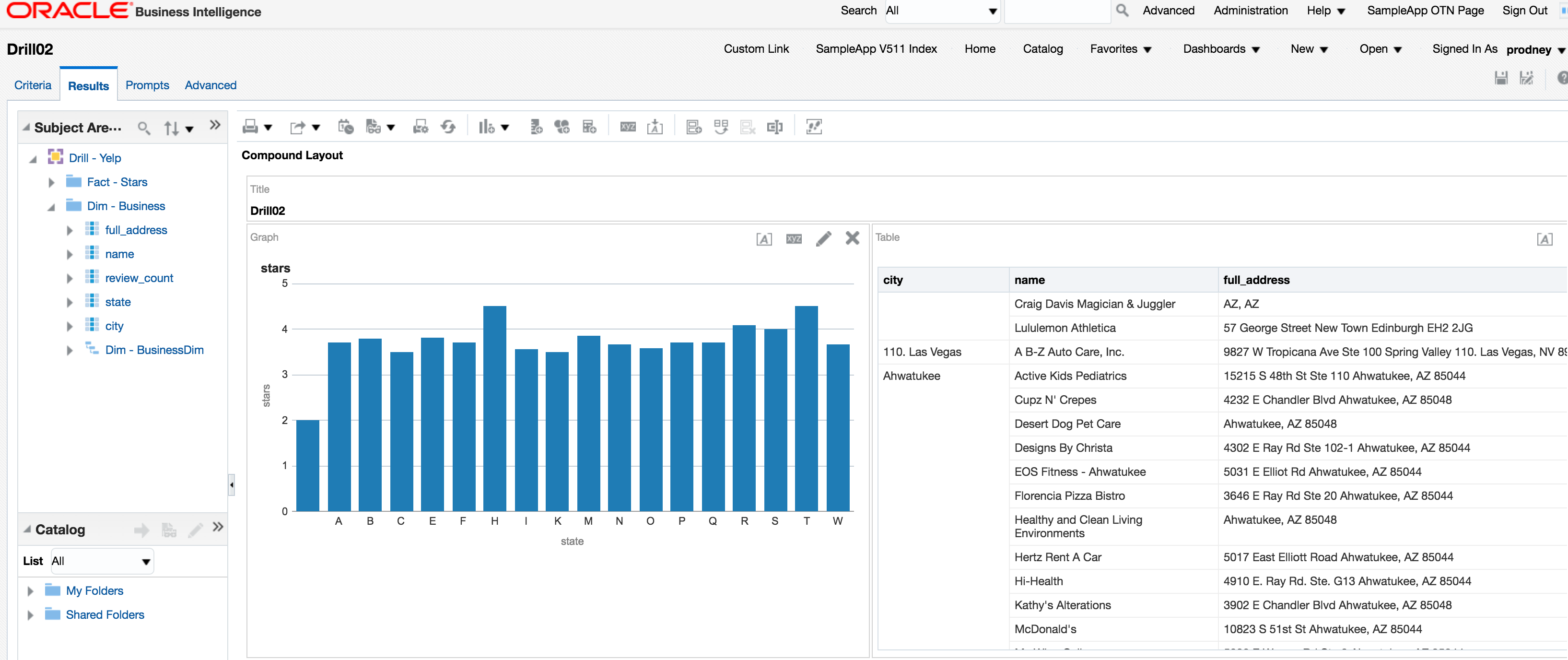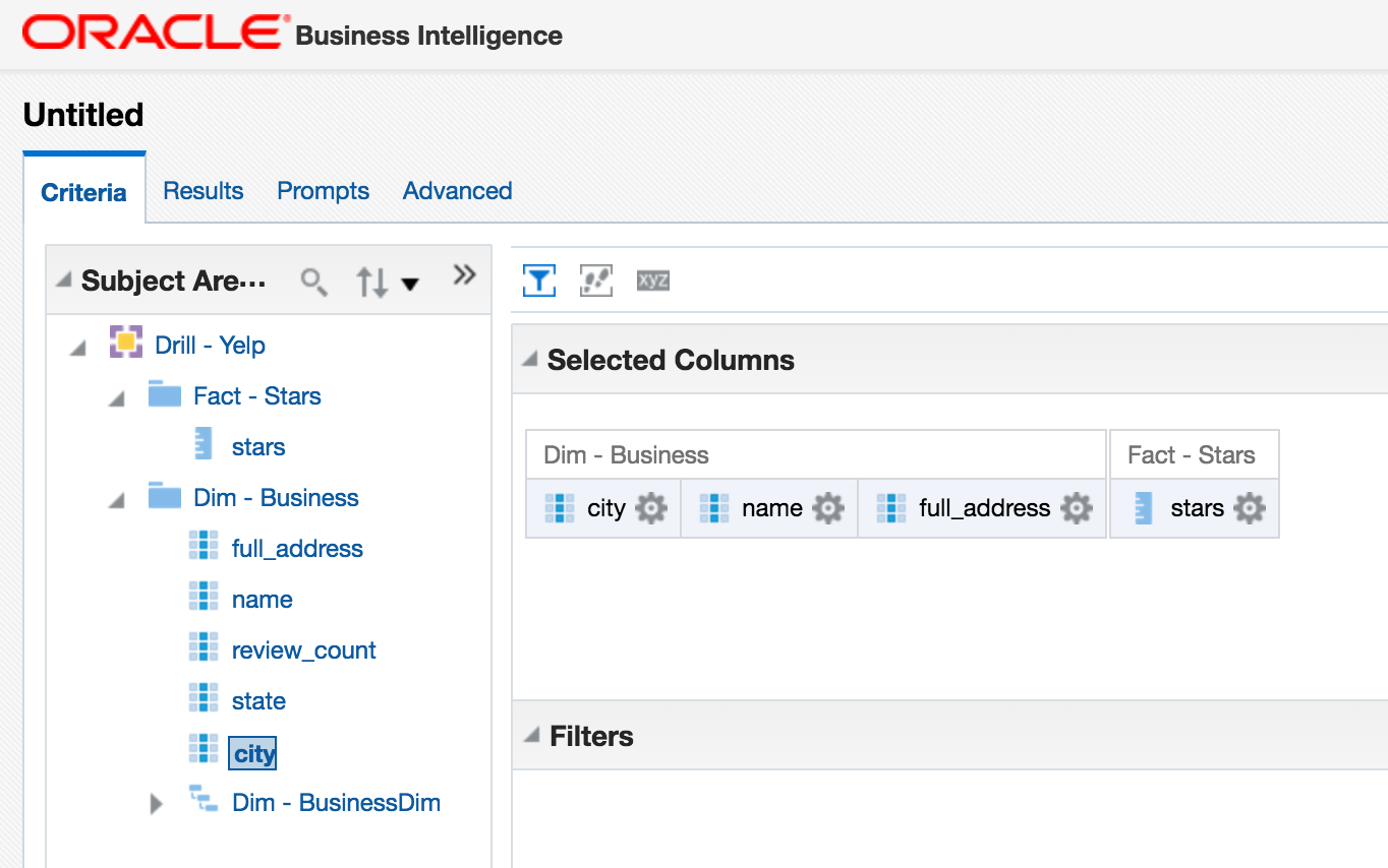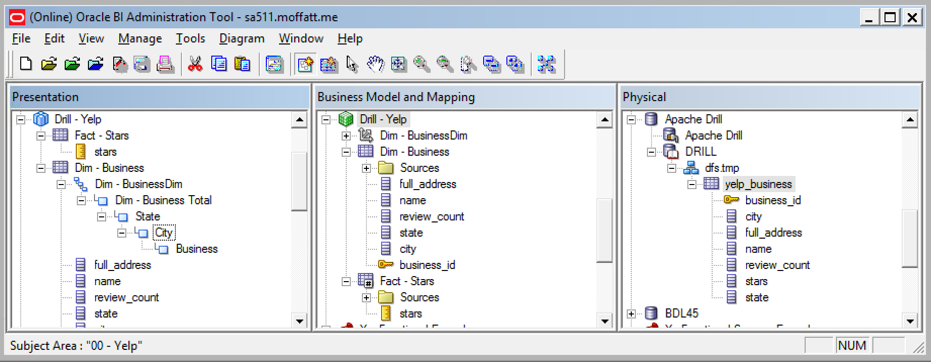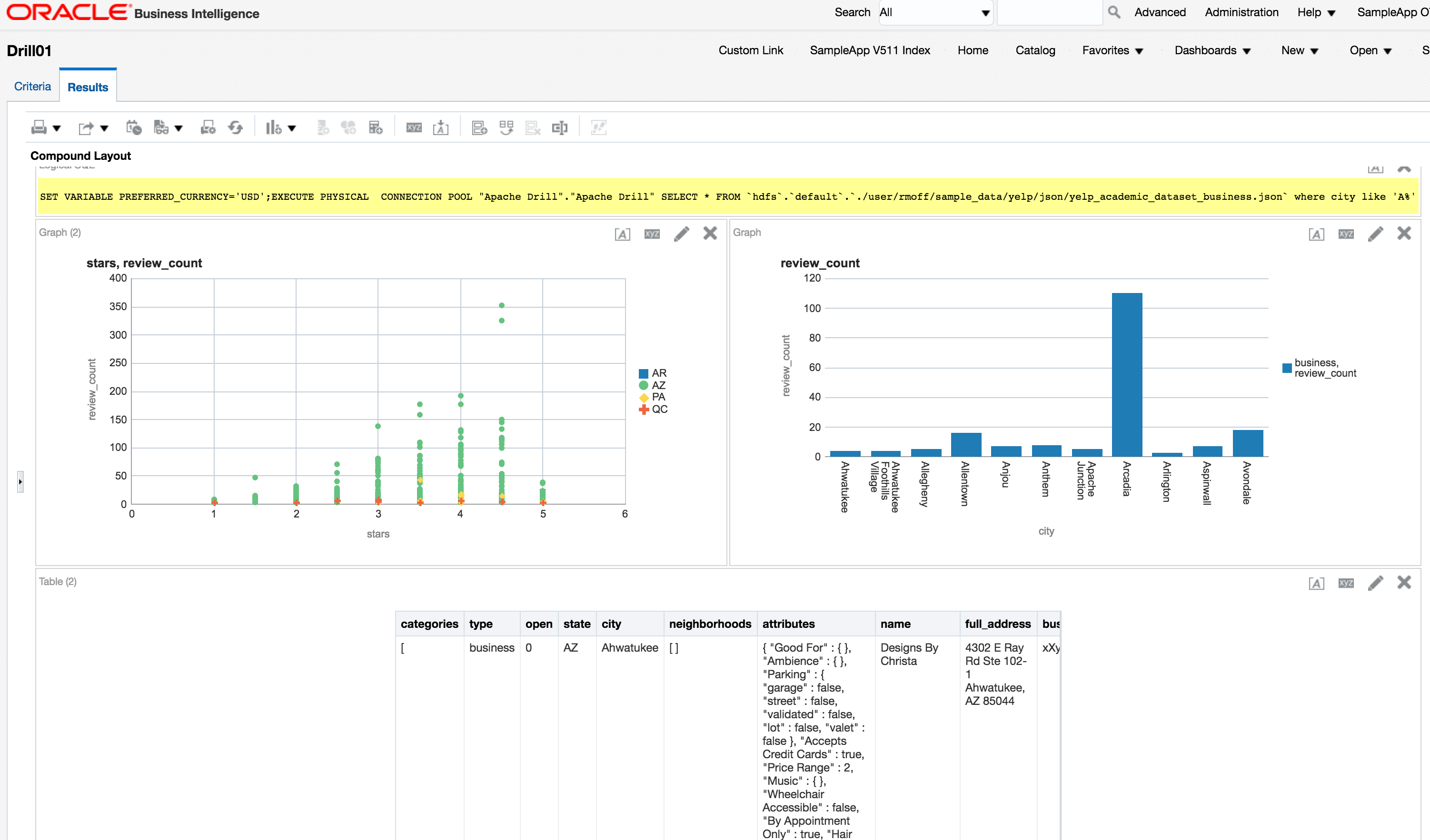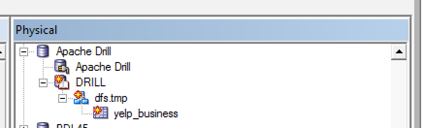 One of the many powerful features of Drill is being able to access nested and array JSON values, which I've discussed in my Introduction to Apache Drill post. The above examples just use root-level attributes, and could easily be expanded out to process some of the nested fields (such as hours in the business data above). For the time being this would be done with DDR, or a Drill view wrapped around it imported into the Physical layer of the RPD.