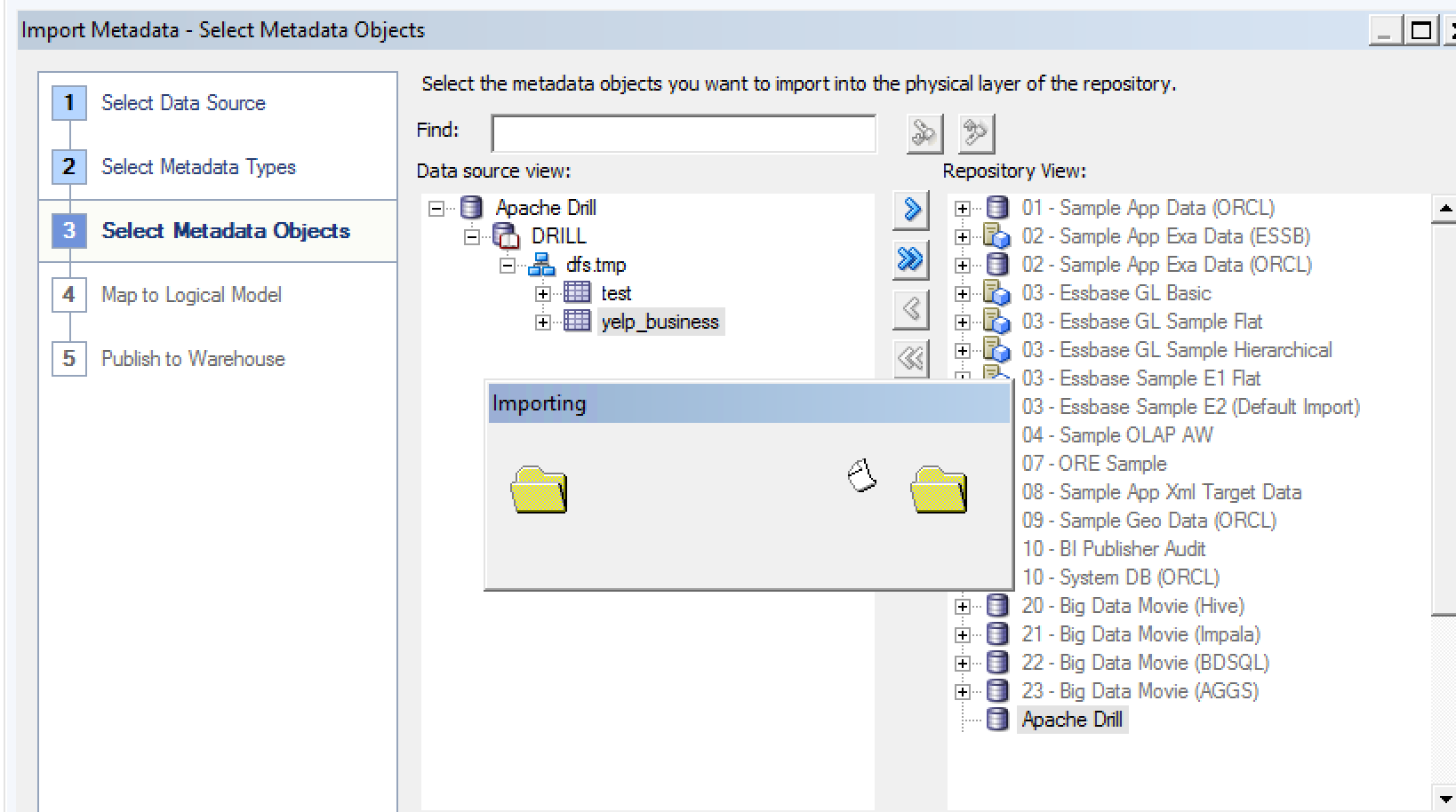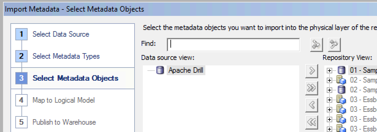This is the very basics necessary to get up and running with OBIEE and Apache Drill. It would be good to see if there's an optimal, least-friction, way for getting tables in Drill exposed to OBIEE without needing to enter each physical column.