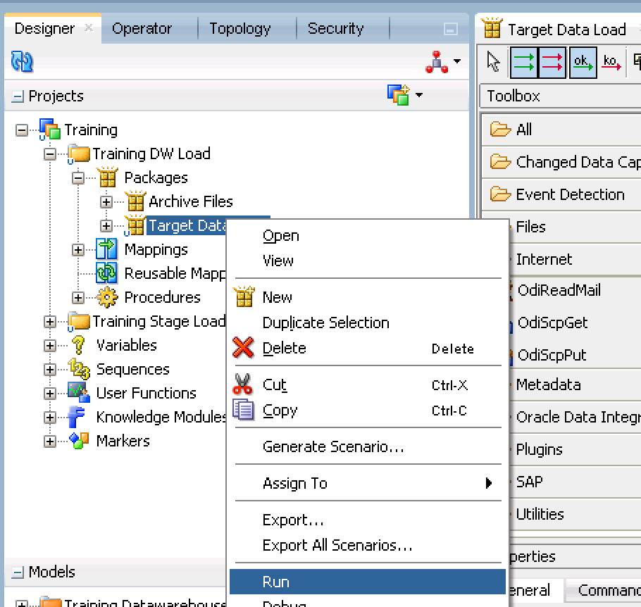 - Before we version the changes, we should test them. Execute the new package by right clicking on the newly modified package, in our tutorial it will be Target Data Load. Click OK and accept the defaults in the Run window.