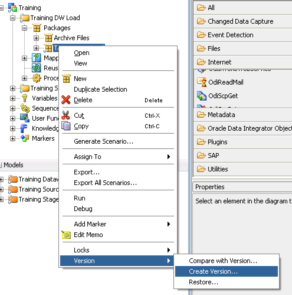A version is a backup copy of an object that is saved as a checkpoint in ODI. ODI allows you to version Projects, Folders, Packages, Scenarios, Load Plans, Mappings, Procedures, Knowledge Modules, Models, Model Folders and Solutions. You will need to decide which objects to create and manage versions for, but this tutorial will review the process using Packages.