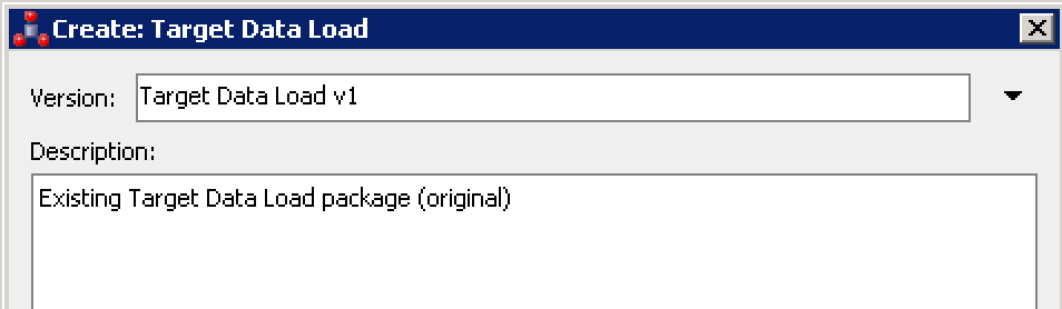 - Type 'Target Data Load v1' as the name and 'Existing Target Data Load package (original)' in the description. You can name the original (or next version, depending on where you are in your versions) whatever you would like. Best practice is to keep the name simple and a version. Make sure to put more descriptive details about the purpose of the version in the description box below the version name.