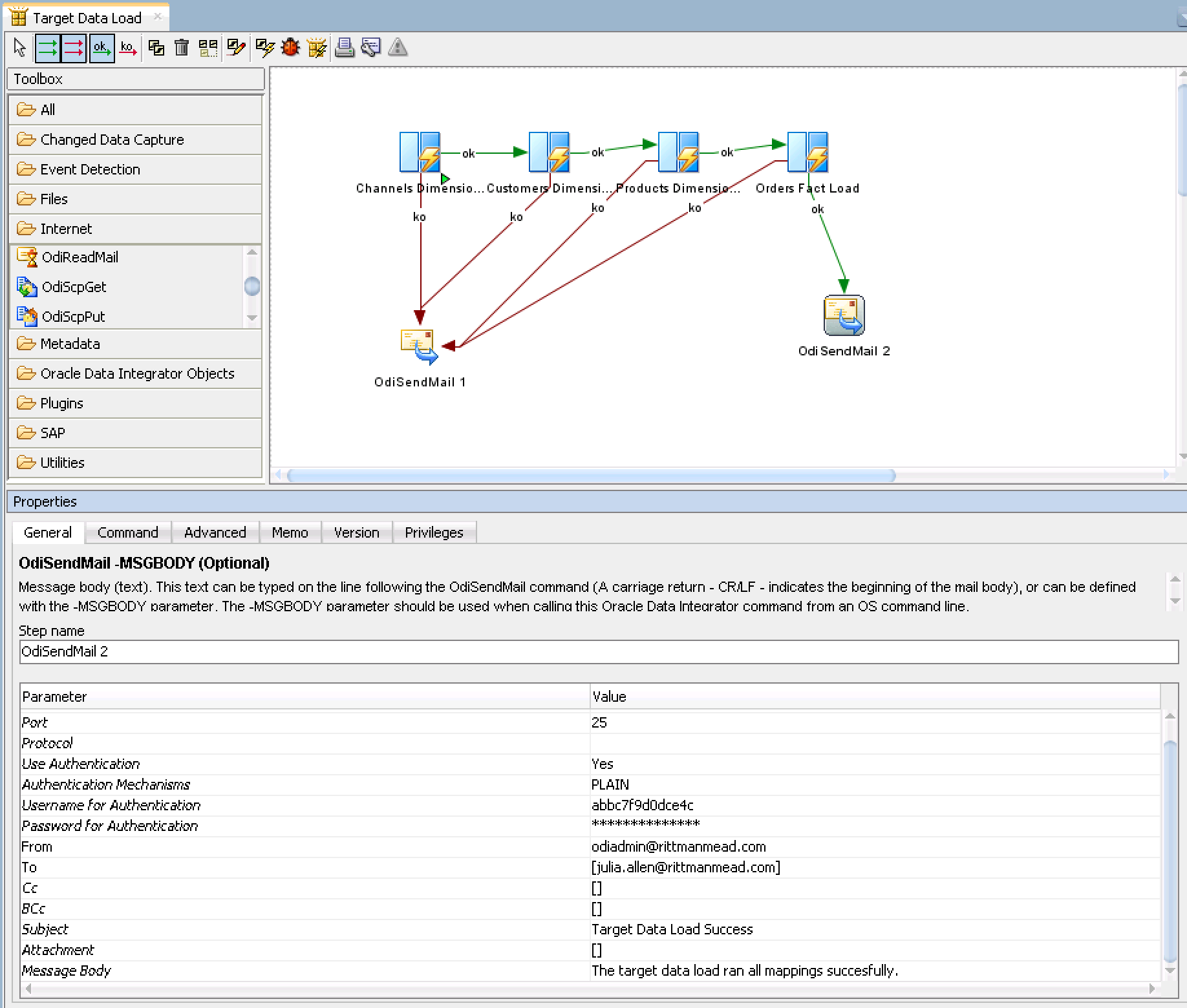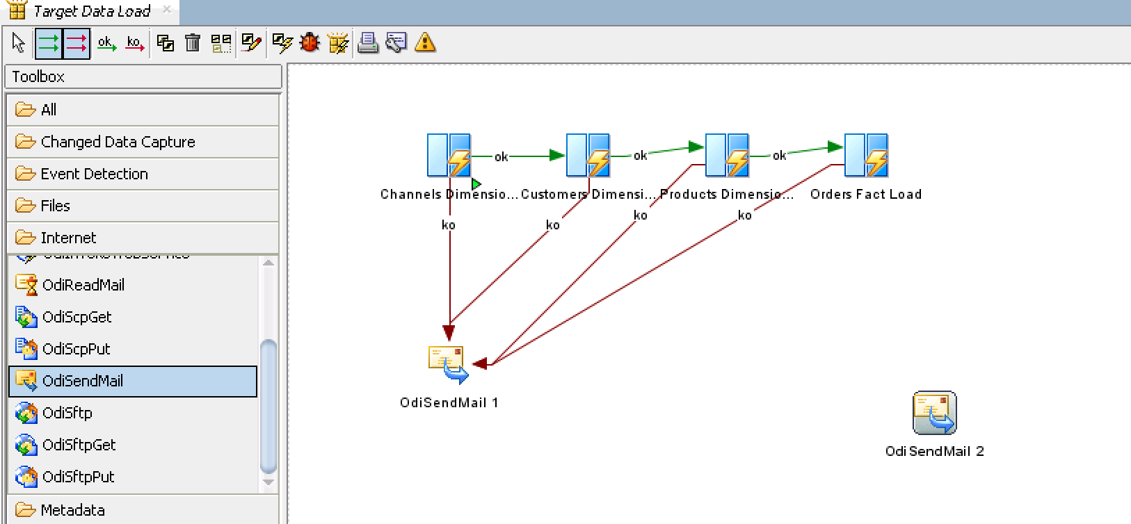 - Using the toolbar connect your last mapping to OdiSendMail 2 using the green ok arrow. Remember to click on the mapping and drag your cursor to OdiSendMail 2.