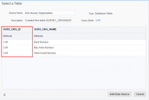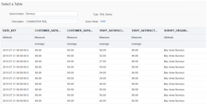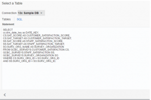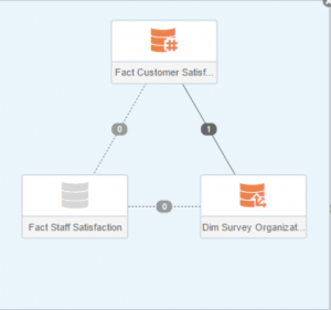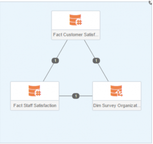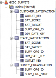 In my sample data, I have another schema called GCBC_SURVEYS which contains two fact tables containing satisfaction scores for both customers and staff and one dimension table containing the organization that conducted the surveys.