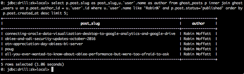 0: jdbc:drill:zk=local> select p.post.slug as post_slug,u.`user`.name as author from ghost_posts p inner join ghost_users u on p.post.author_id = u.`user`.id where u.`user`.name like 'Robin%' and p.post.status='published' order by p.post.created_at desc limit 5;