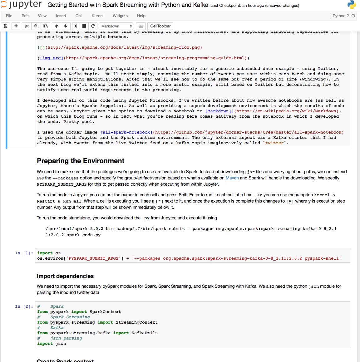 I used the docker image all-spark-notebook to provide both Jupyter and the Spark runtime environment. By using Docker I don't have to really worry about provisioning the platform on which I want to develop the code - I can just dive straight in and start coding. As and when I'm ready to deploy the code to a 'real' execution environment (for example EMR), then I can start to worry about that. The only external aspect was an Apache Kafka cluster that I had already, with tweets from the live Twitter feed on an Apache Kafka topic imaginatively called twitter.