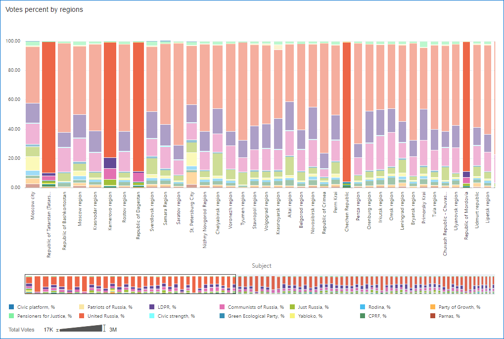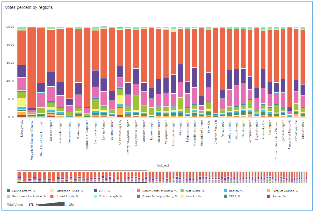 That’s not a proven charge (see disclaimer #2) but for me these regions look a bit suspicious. Their results are very uncommon. United Russia ruling party (orange bars) got an extremely high result in these few regions. This may be a sign of some kind of interfere with an election process there. But of course, other explanations (including a measure incorrectly selected for sorting) exist.