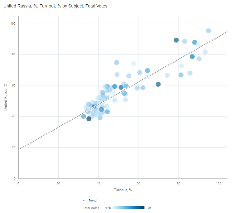 In order to visualise this hypothesis, I built a Scatter chart. Its horizontal axis is Turnout,% and vertical one United Russia, %. And I added a trend line to make things more obvious. Colour density shows Total votes.