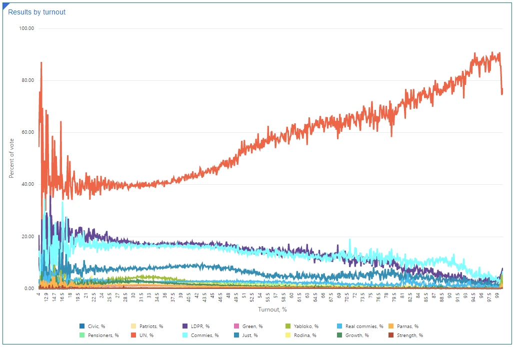 I think my hypothesis just got a strong support. As usual it is not an absolutely impossible situation. But it's hard to explain why the more people come to voting stations the higher one party result is. I'd expect either high result not depending on the turnout (more or less like Uniform distribution) or at least a few exceptions with high turnout and low result.
