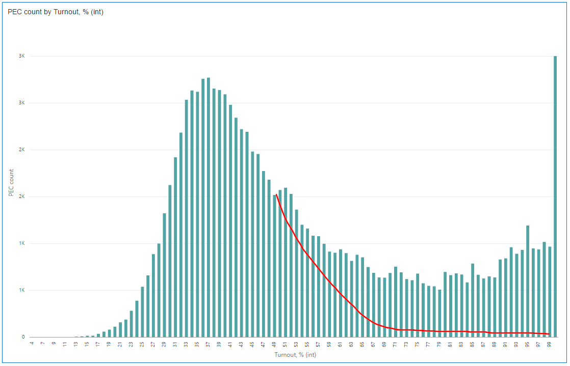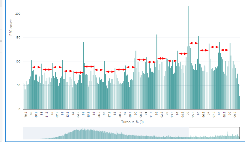 Here is my favourite part of the chart. I marked 1% intervals, and you can see that round turnout value is always more probable than its closest non-round neighbours. No exceptions. A possible explanation is that the number of commissions with results that high is relatively low and even the slightest manipulation is clearly visible.