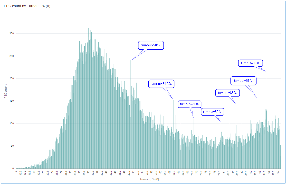 So far all my charts were about relative measures, it's time to check some absolute values. Here is a Bar chart which shows a number of precinct commissions by results. I'd expect to see something close to normal distribution - a bell-shaped chart with the maximum around 54% (average turnout). Now, look at the real chart (bin size=1.0%). Its maximum is at 36-37%.