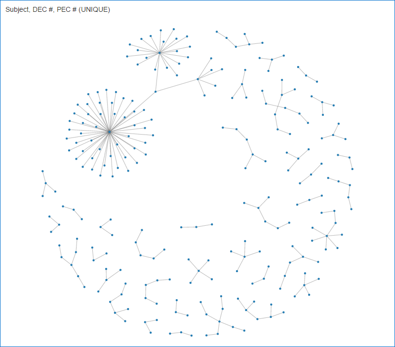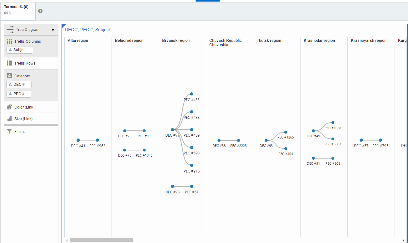 The first one is Tree Diagram. It shows all existing combinations of district and precinct commissions by regions for the filtered data (turnout=64.3). And in order to demonstrate how it works for this case I made an animation. Most of the regions have a few commissions with 64.3% turnout. But Saratov region beats them all.