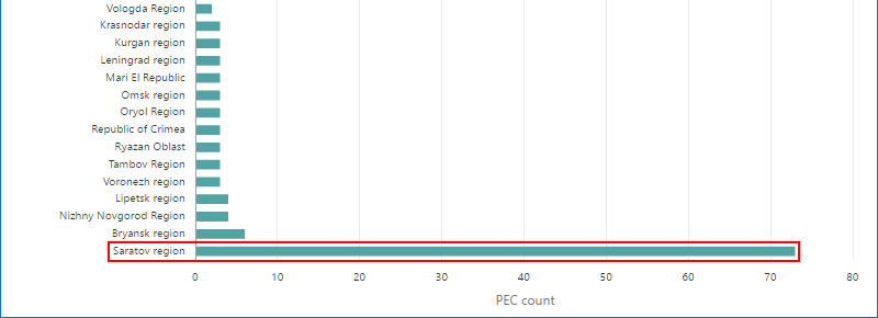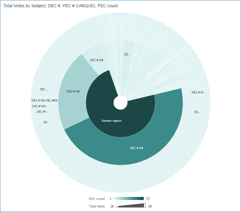 Or if you prefer more traditional charts, here is Sunburst for you. Its sectors size shows Total votes and the colour is PEC count. It gives a good representation of how uncommon Saratov's result is.