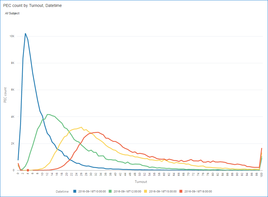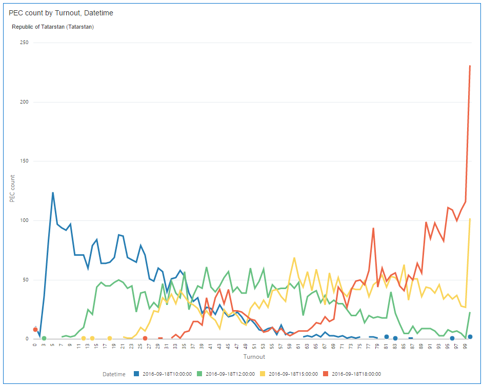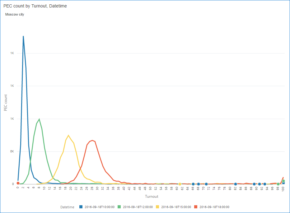 The first chart shows the number of commissions (vertical axis) by the official turnout (horizontal axis). Colour shows the moment of time. Strictly saying I shouldn't have used continuous linear charts for discrete values, but coloured overlapped bars don't give that clear picture.