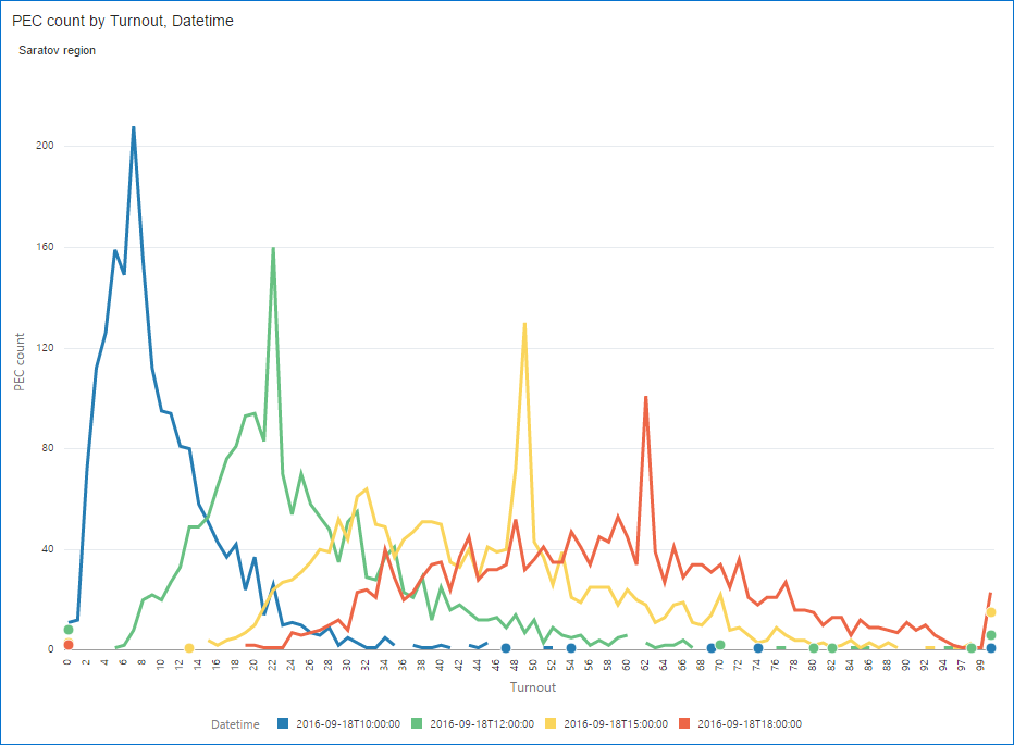 Considering all these charts I'd say that almost exclusive concentration of commissions with 63.4% turnout in Saratov doesn't look normal for me. It's pretty weird that sibling commissions show exactly the same figures.
