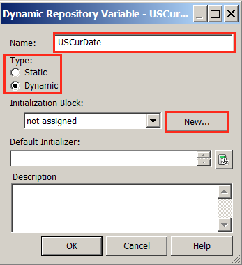 I am going to start by creating the Repository Variable for the current date. Since this variable will be dynamic, I need to make sure I select the option 'Dynamic' and I am going to give it the name USCurDate.
