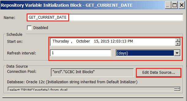 Once in the Repository Variable Initialization Block screen, I need to give the init block a name, set the schedule for when variable or variables will be refreshed then click Edit Data Source to define the connection pool the init block will use as well as the initialization string (query) the init block will use to populate the Repository Variable.