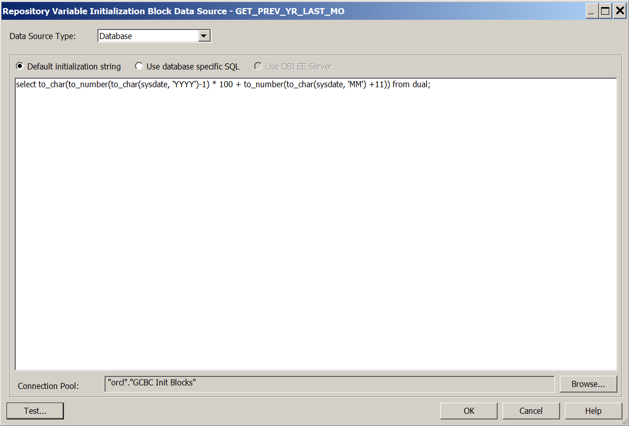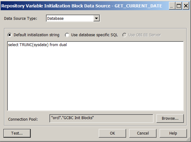 In the data source window, I am going to set my connection pool to one I have created just for my init blocks and then type in the following into the initialization string window: