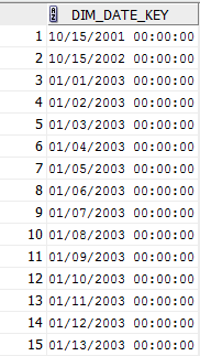 As you can see by the results of my query, the DIM_DATE_KEY column does have the same format as sysdate but all the times are set to 00:00:00 (or midnight). To further demonstrate the difference between my date column and sysdate, I am going to write a new query and use the TRUNC (or TRUNCATE) function.