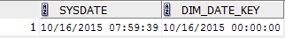 As you can see, the query runs successfully but notice how sysdate and DIM_DATE_KEY still have different times. How is the join possible? Because I used the truncate function in the where clause in my query for sysdate. Without going into too much detail, using truncate on a date function without any formatting (which I will cover later) will set (or truncate) the datetime to the start (or midnight) of the current day. For example, if I run another query that just selects the truncated sysdate from dual, I get this result.