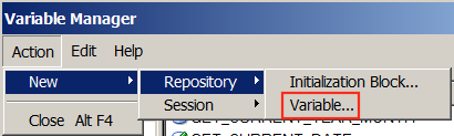 From the Variable Manager window, I can create a Repository Variable by selecting Action > New > Repository > Variable.