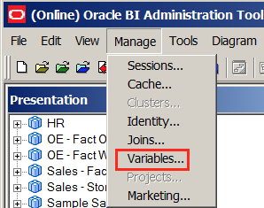 Repository Variables are created using the Admin Tool. By launching the Admin Tool and opening my RPD in online mode (can also be created offline), I can go to Manage > Variables to start creating my first Repository Variable.
