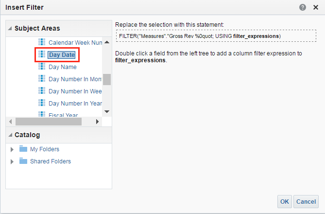 From here the Insert Filter window will pop up and I can select the attribute column to filter the measure by. Here, I want to use the column Day Date to filter Gross Rev $ by the day.
