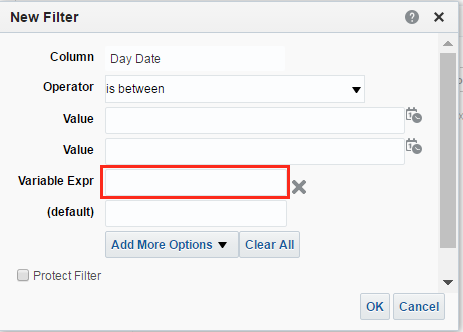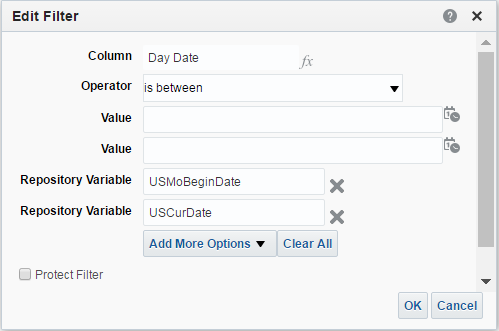Here I need to define the operator as is between since we are dealing with date ranges. I could call my Repository Variables for current_date and first day of the month here but, because the request is for a prompt to select between date ranges, I am going to have to call Presentation Variables and use the prompt to populate the actual values.