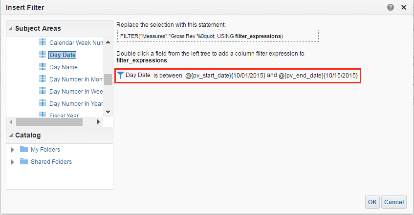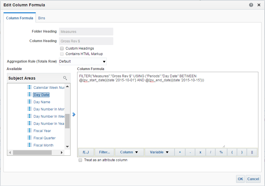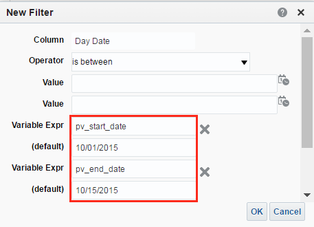 Now I need to add both my start and end date Presentation Variables in the Variable Expr boxes. I’m going to call my start date presentation variable pv_start_dt and my end date presentation variable pv_end_dt. I am also going to specify a default date range from the beginning of the current month (10/01/2015) to yesterday's date (10/15/2015).