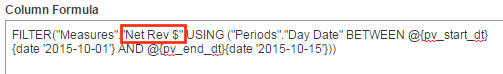 Now I have to do the exact same thing for the Net Rev $ column. Since the filter expression is identical, I can simply copy and paste the column formula for Gross Rev $ and replace the column name in the expression.