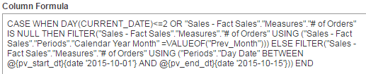 CASE WHEN DAY(CURRENT_DATE)<=2 OR "Sales - Fact Sales"."Measures"."# of Orders" IS NULL THEN FILTER("Sales - Fact Sales"."Measures"."# of Orders" USING ("Sales - Fact Sales"."Periods"."Calendar Year Month" =VALUEOF("Prev_Month"))) ELSE FILTER("Sales - Fact Sales"."Measures"."# of Orders" USING ("Periods"."Day Date" BETWEEN @{pv_start_dt}{date '2015-10-01'} AND @{pv_end_dt}{date '2015-10-15'})) END