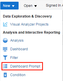 Now I need to create my dashboard prompt. I am going to start by clicking on New > Dashboard Prompt.
