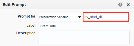 I need to create two prompts: One for the start date and one for the end date. Because I am using presentation variables as placeholders for the date between values, I have to use a Variable Prompt instead of a Column Prompt. Variable Prompts allow us to define a presentation variable and then define a list of values for the users to select from.