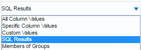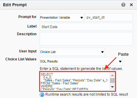 Because this is not a column prompt, I have to manually specify the values I want the user to be able to select from. Rather than typing in each value, I can use the SQL Results option from the Choice List Values dropdown and use a SQL statement to select the exact values that I want.