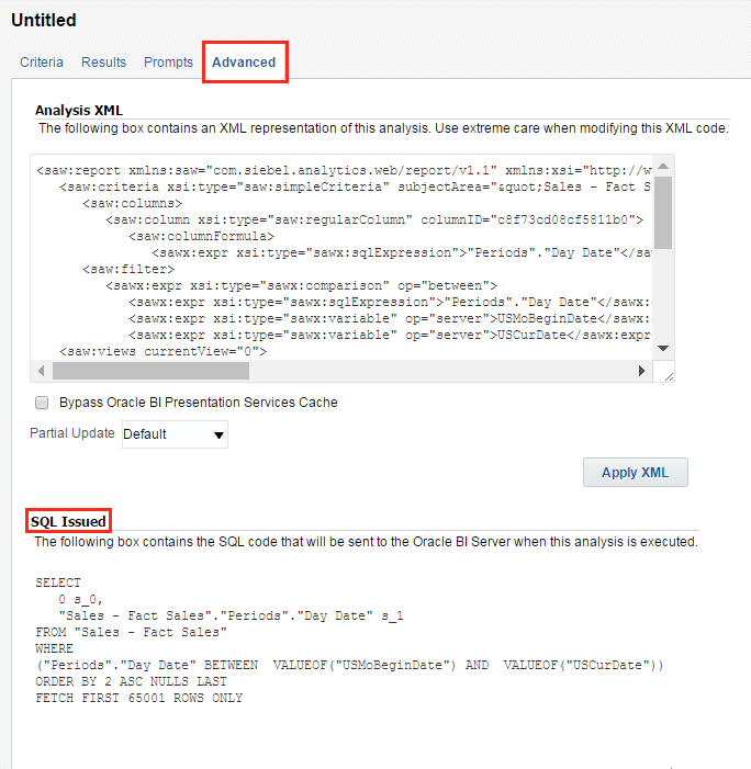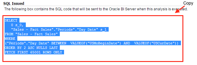 there are numbers and s_# between the SELECT and Day Date column, after the Day Date column and there is also an order by clause that uses a number “2”. Without going into too much detail, this what OBI uses to make the query more efficient when retrieving results from the database. In order to allow the values to populate the prompt, these have to be removed in OBIEE 12c and the “ORDER BY” clause has to be rewritten in order to make it work.