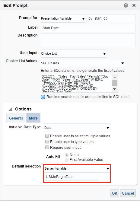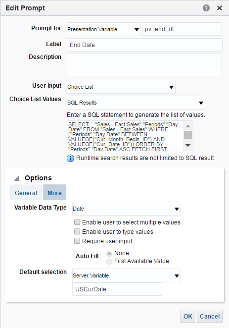 Now I need to create another Variable Prompt for the End Date. The SQL statement used for Start Date can be reused for the values as we want the exact same values to be available for selection. I am going to specify the presentation variable to be named pv_end_dt, and the default value to be the USCurDate Repository Variable so that the End Date prompt always defaults to the current date.