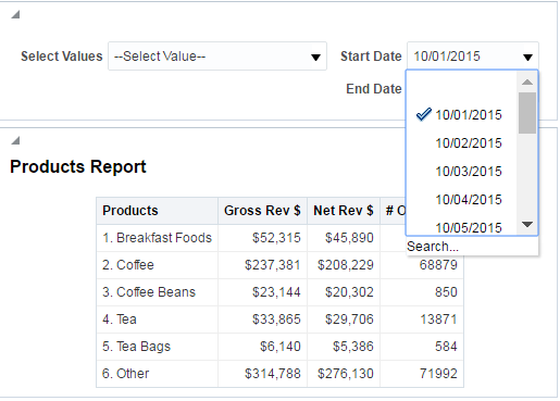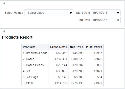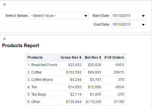 In this example, I have been asked to create a report that is going to reside on a products dashboard. It needs to have the same product grouping as the report I used part one of this series, needs to contain Gross Rev $, Net Rev $ and # of Orders and have a prompt that can select between the first and current day of the month and every day in-between. The person who requested the report wants the prompt to change dynamically with each month and does not want users to be able to select future dates.