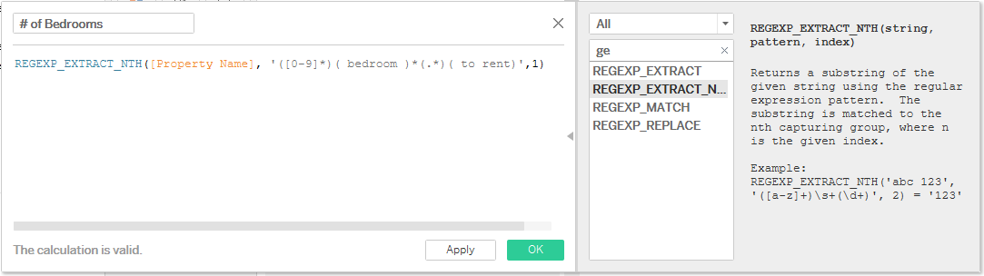 I can easily use REGEXP_EXTRACT_NTH and get what I want. Group 1 is the number of bedrooms and Group 3 is the property type. Groups 2 and 4 are just constant words.