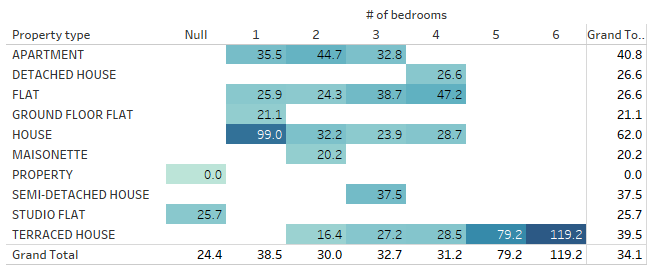 And while I'm not a big fan of fancy visualisations but if you need something less formal and more eye-catching try Bubbles chart. It's not something I'd recommend for an analysis but may work well for a presentation. Every bubble represents particular property type, colour shows a number of bedrooms and size shows the number of properties.