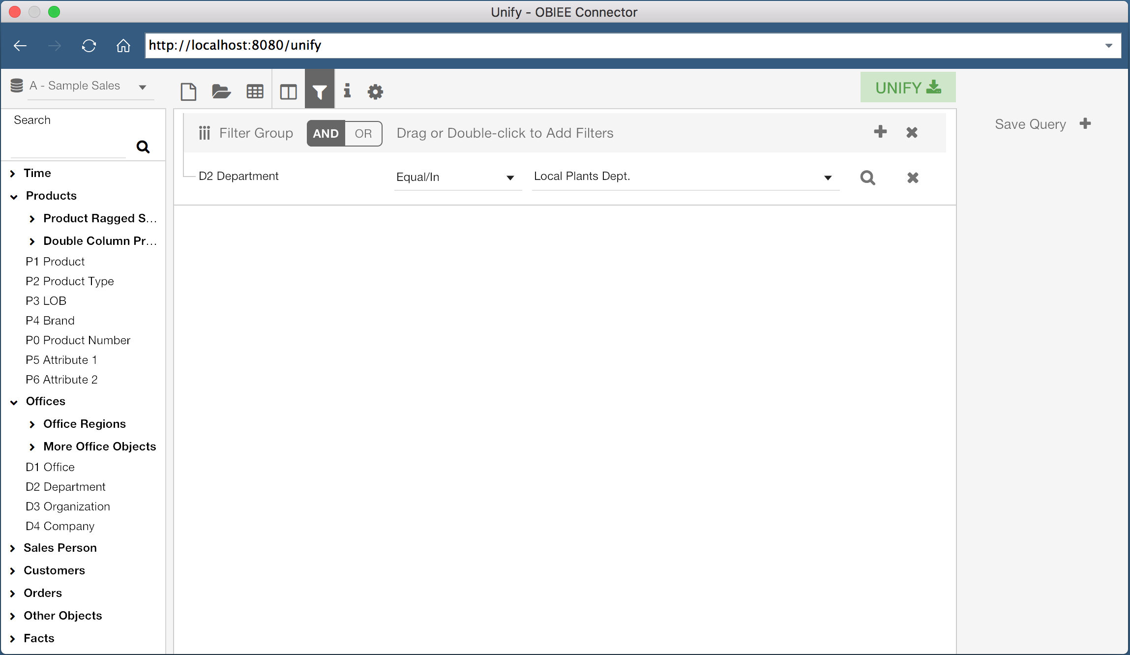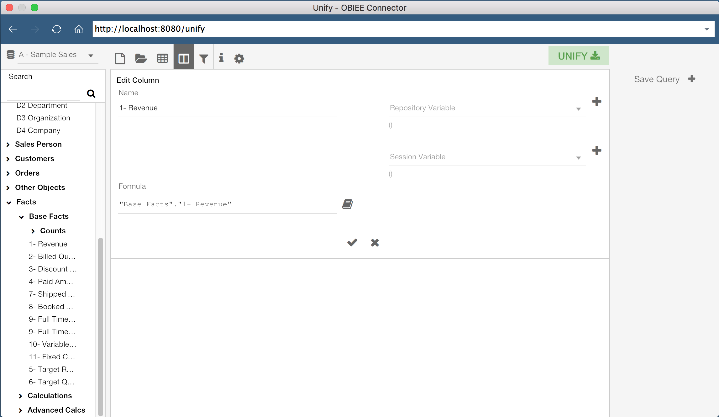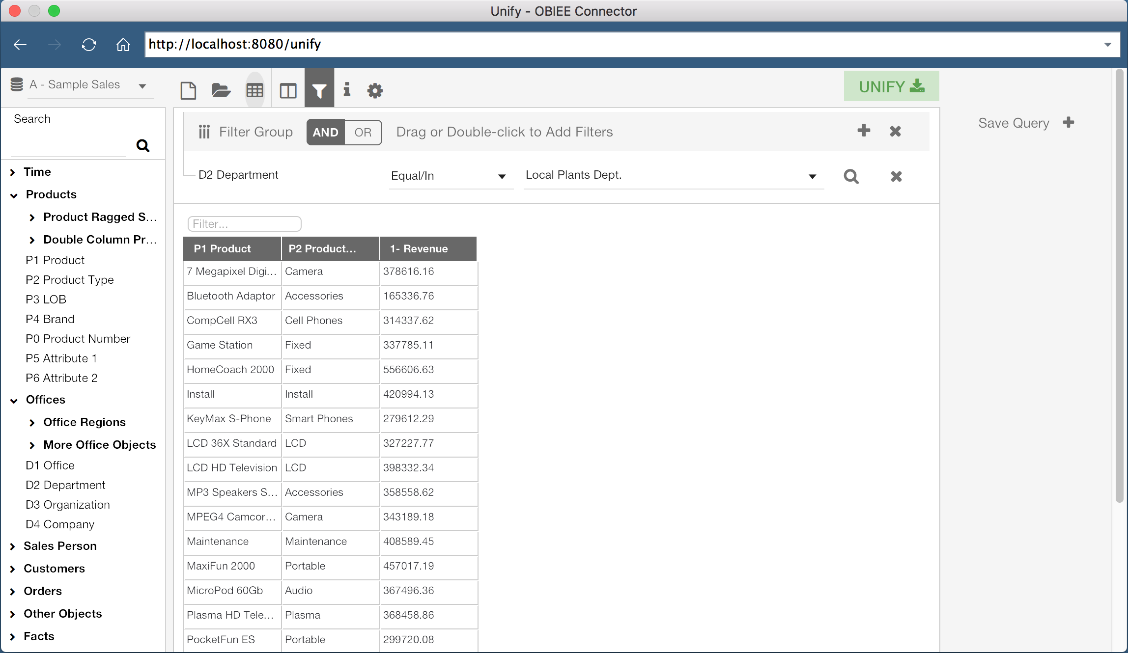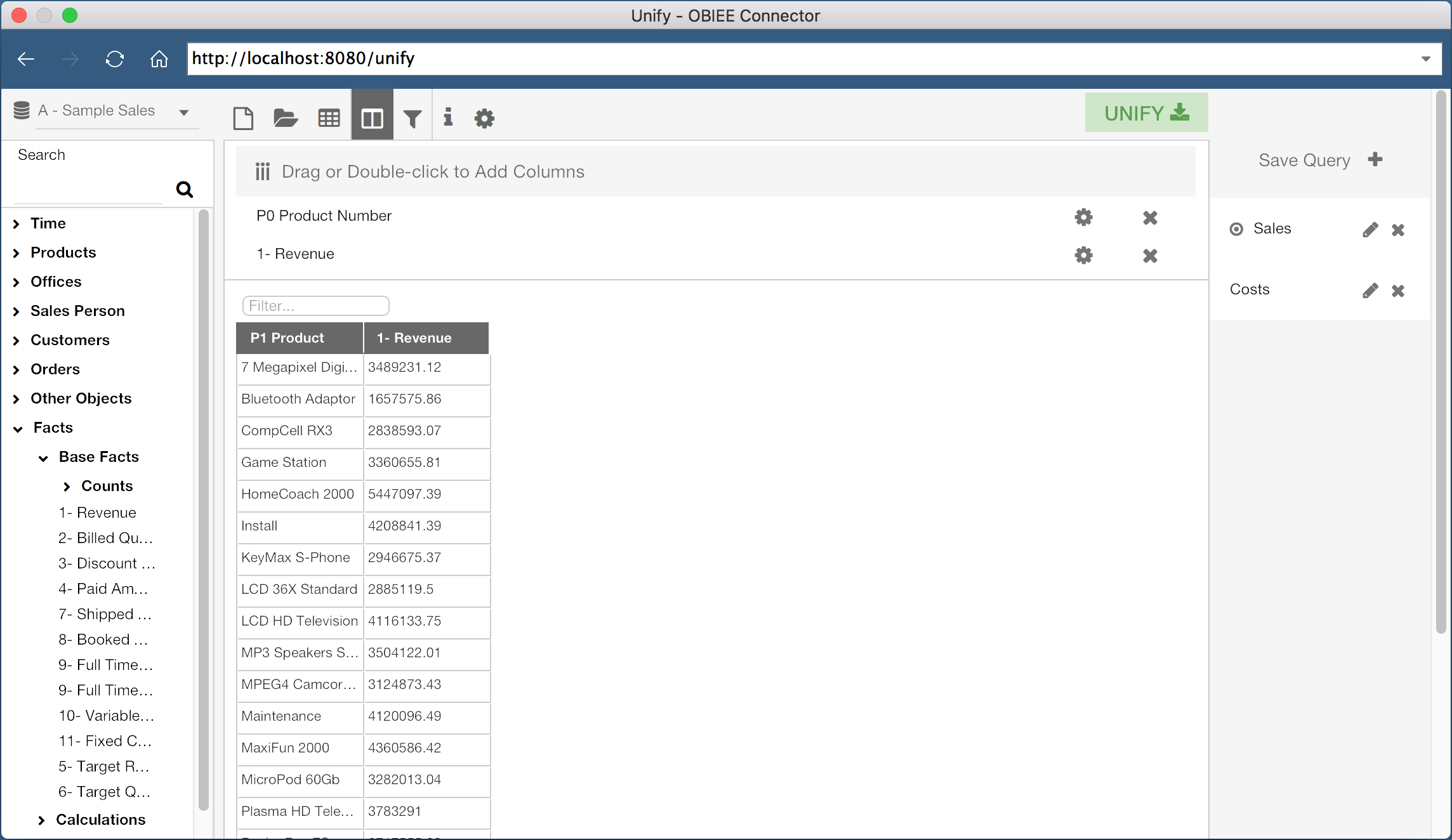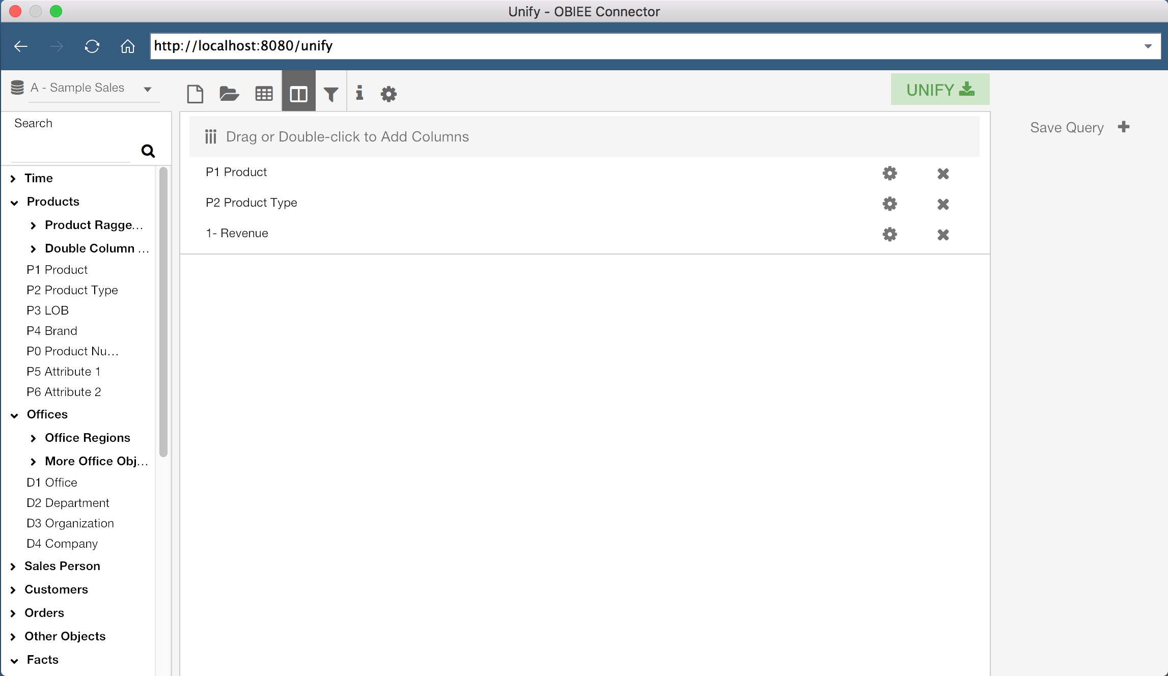 Unify allows us to either build a new query from scratch, or select an existing OBIEE report. First, let’s build our own query. The lefthand side of the screen displays the Subject Areas and Columns which I have access to in OBIEE. With a Subject Area selected, I can drag columns, or double click them, to add them to the current query. In the screenshot above, I have added three columns to my current query, “P1 Product”, “P2 Product Type”, and “1 - Revenue”.